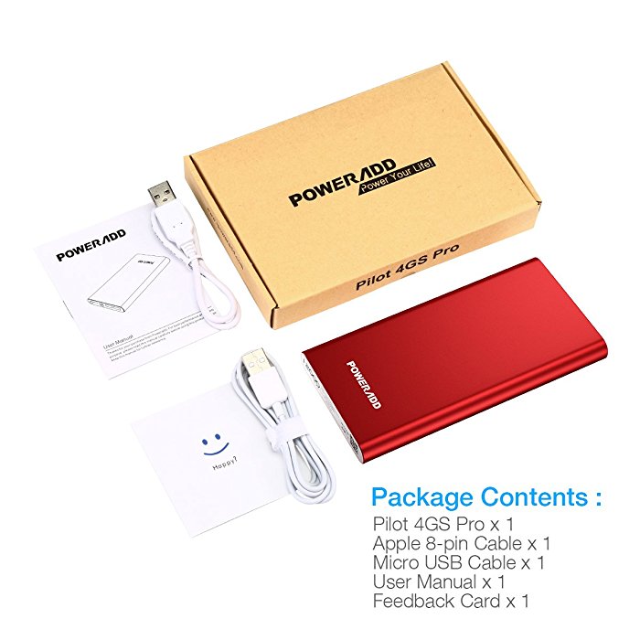 Poweradd Pilot 4GS Pro power bank is an upgraded version to its previous Pilot 4GS. 4GS Pro has one more Micro input and one more Micro USB cable to offer. The power bank comes with a lightning 8-pin cable too, which allows you to charge an iPhone 6s and a Samsung Galaxy S7 simultaneously, for example. Please note that the power bank does not support using the dual input ports simultaneously as the maximum input is 5V/2A.
