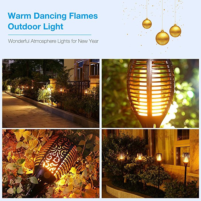 The solar torch has a special pattern design on the light bulb that will look like realistic flames when you turn the light on. The flickering flames create beautiful torch effect in the dark. The solar light is made up of 96 small LEDs. A small LED gives off eye-caring flickering warm yellow illumination with 28LM. The outdoor solar tiki torches are perfect for driveway, garden, swimming pool, and decoration for parties, festivals and so on.