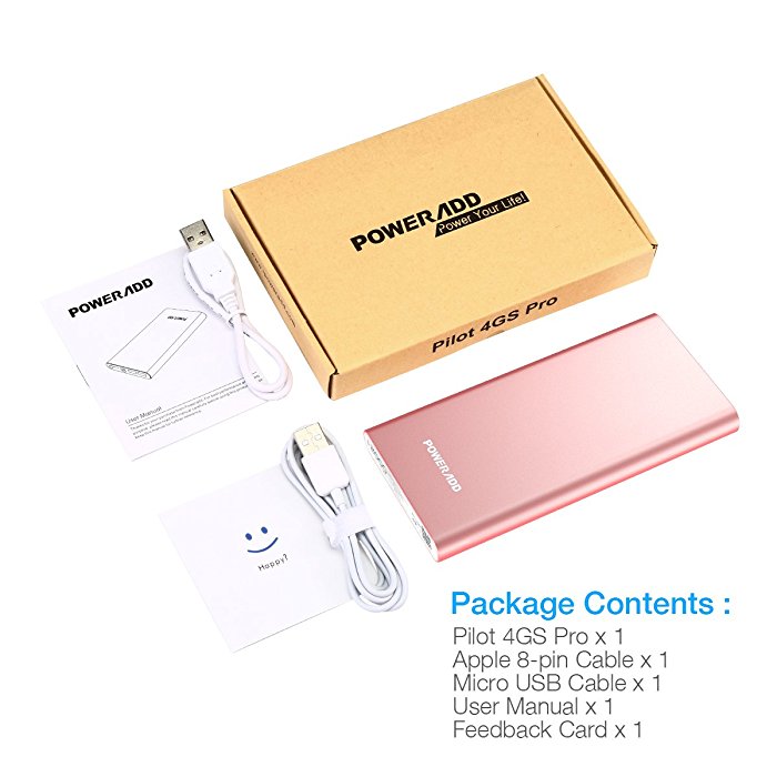 Poweradd Pilot 4GS Pro power bank is an upgraded version to its previous Pilot 4GS. 4GS Pro has one more Micro input and one more Micro USB cable to offer. The power bank comes with a lightning 8-pin cable too, which allows you to charge an iPhone 6s and a Samsung Galaxy S7 simultaneously, for example. Please note that the power bank does not support using the dual input ports simultaneously as the maximum input is 5V/2A.