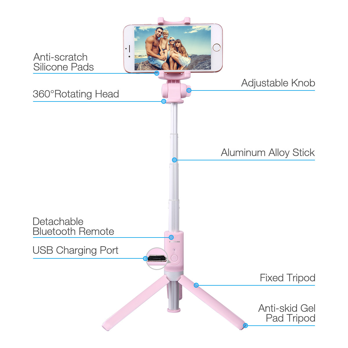 This Poweradd monopod extendable selfie stick uses advanced Bluetooth 3.0 for wireless Bluetooth shutter remote control. It simply allows you to control the shutter up to 10 meters away for the maximum. The detachable Bluetooth shutter has easy Bluetooth pairing. It’s widely compatible with most cellphones on the market, it works greatly for both iOS and Android smartphones. The wireless Bluetooth selfie stick can turn into a tripod quickly for its built-in tripod stand design.