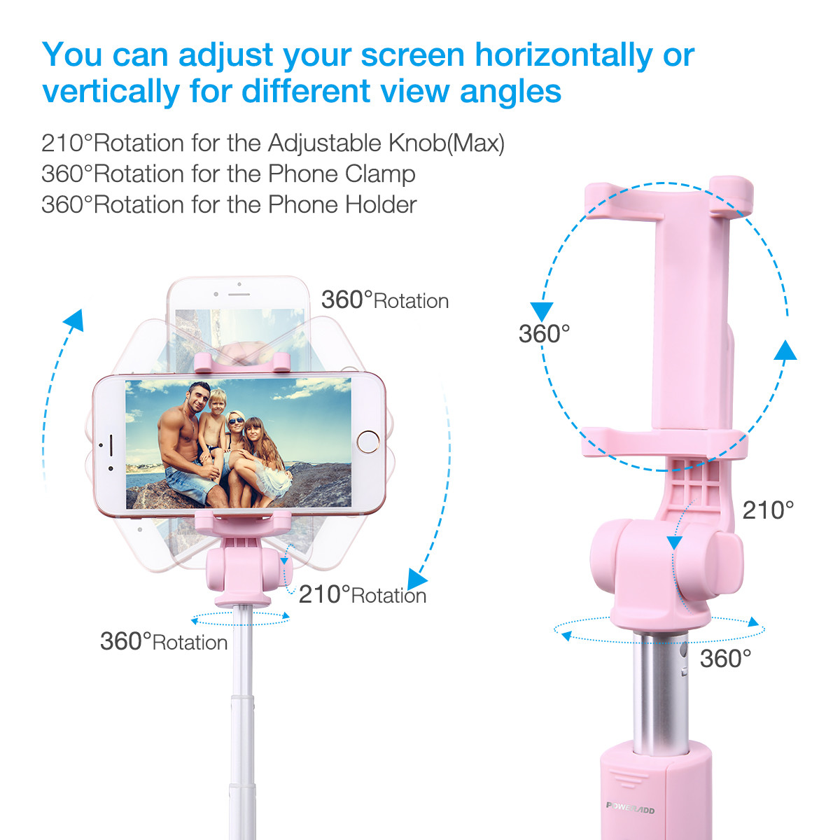 This adjustable selfie stick is designed with a 360 degrees rotatable phone holder, a 210 degrees rotating head and an adjustable knob for taking photos both horizontally and vertically. The phone holder is a new type of telescoping clamp that is able to hold your cellphone securely in place using a strong built-in spring. The cellphone clamp can be easily adjusted from 55 to 71 mm to fit cellphones of different sizes.