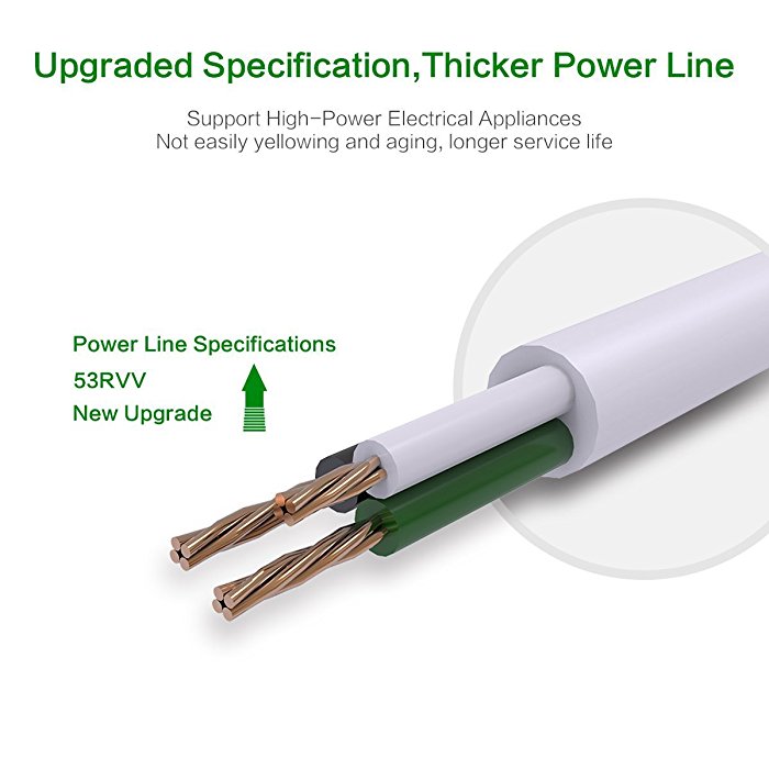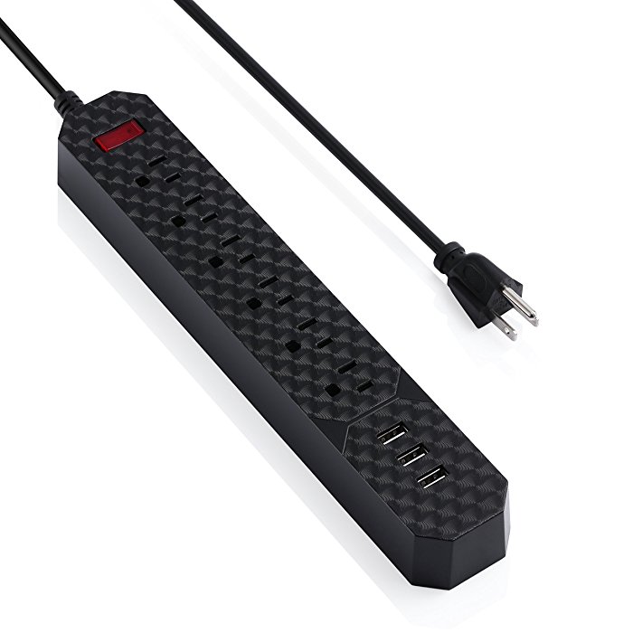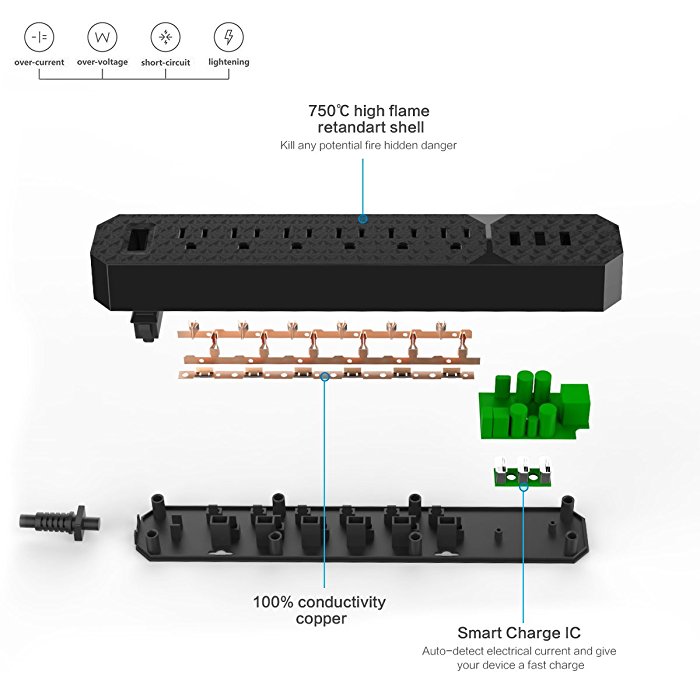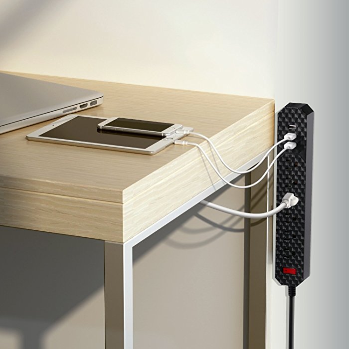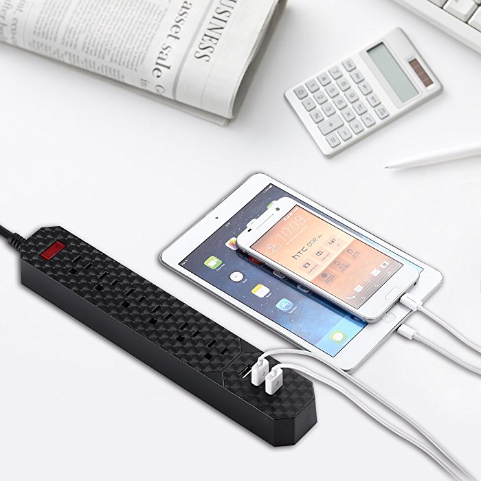 The black surge protector power strip has 3 USB charging ports to charge 3 devices at the same time. It has a premium built-in intelligent charge chip, which means it can deliver quick charging speed via the USB ports, 2.4A per port. The USB’s output is Max 3.4A, which allows you to charge your iPad and iPhone simultaneously.