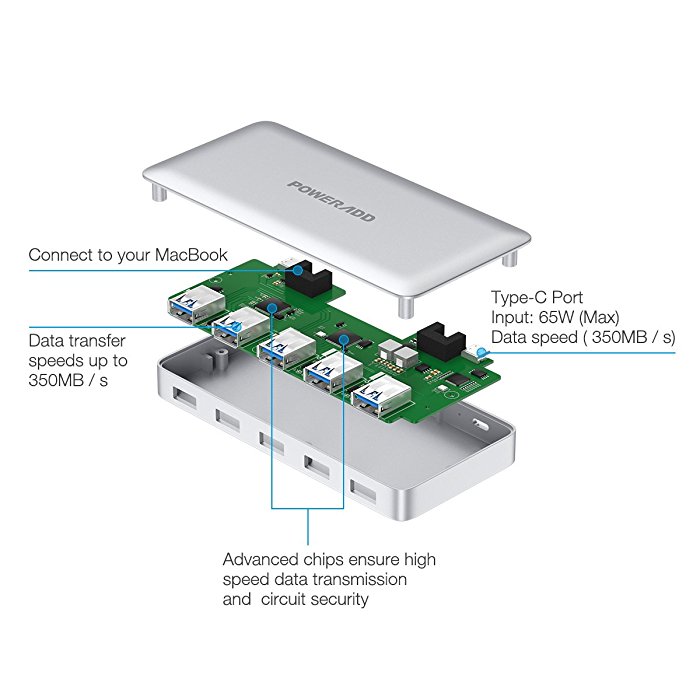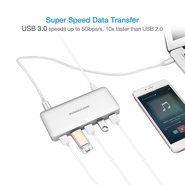 Poweradd Portable 5-Port USB 3.0 Type C Hub 5Gbps Data Transfer Speed